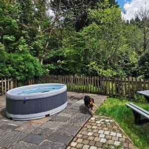- The private garden to the rear of the neighbouring holiday cottages overlooks the River Clydach. A hot tub sits centre stage on a Gwrhyd sandstone patio – a beautiful local stone valued for its fossilised ripple patterns that formed in a tropical lagoon many millions of years ago.